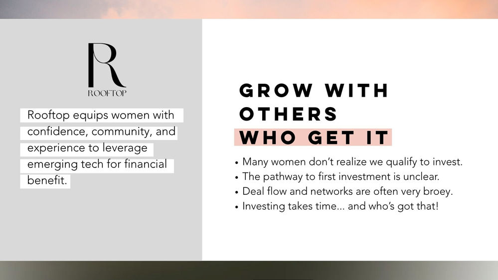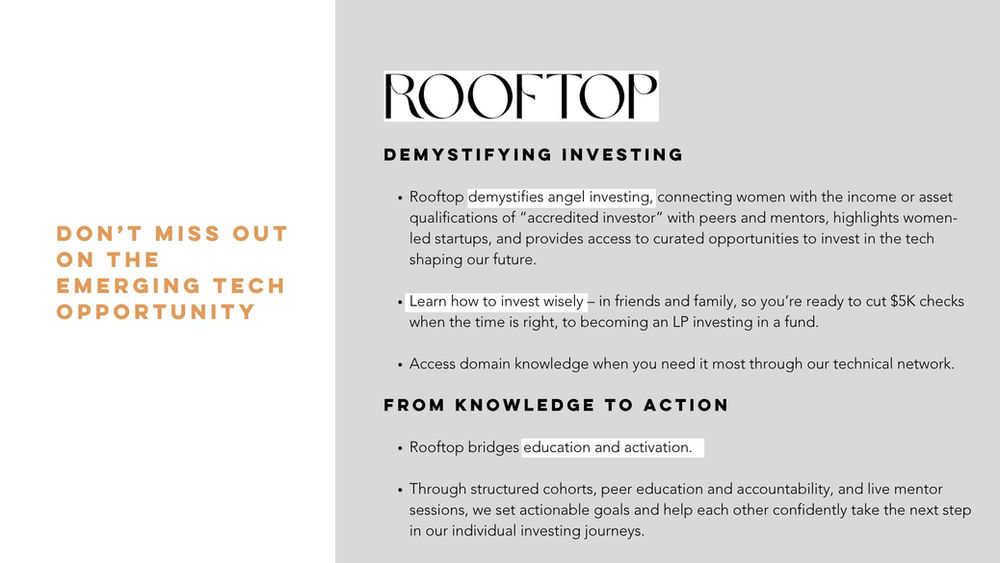 Rooftop is your avenue to meaningful impact in the evolving landscape of tech and investing. We provide a supportive and enriching community to help you navigate it. We are dedicated to empowering women to make meaningful impact for themselves and others.